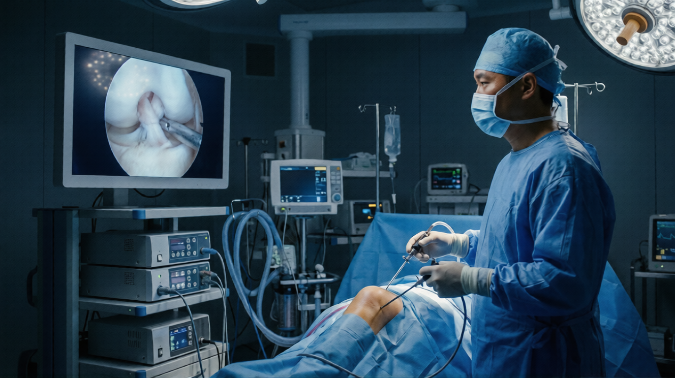 Tindakan & Hasil: Penjahitan atau perapihan jaringan meniskus via artroskopi.