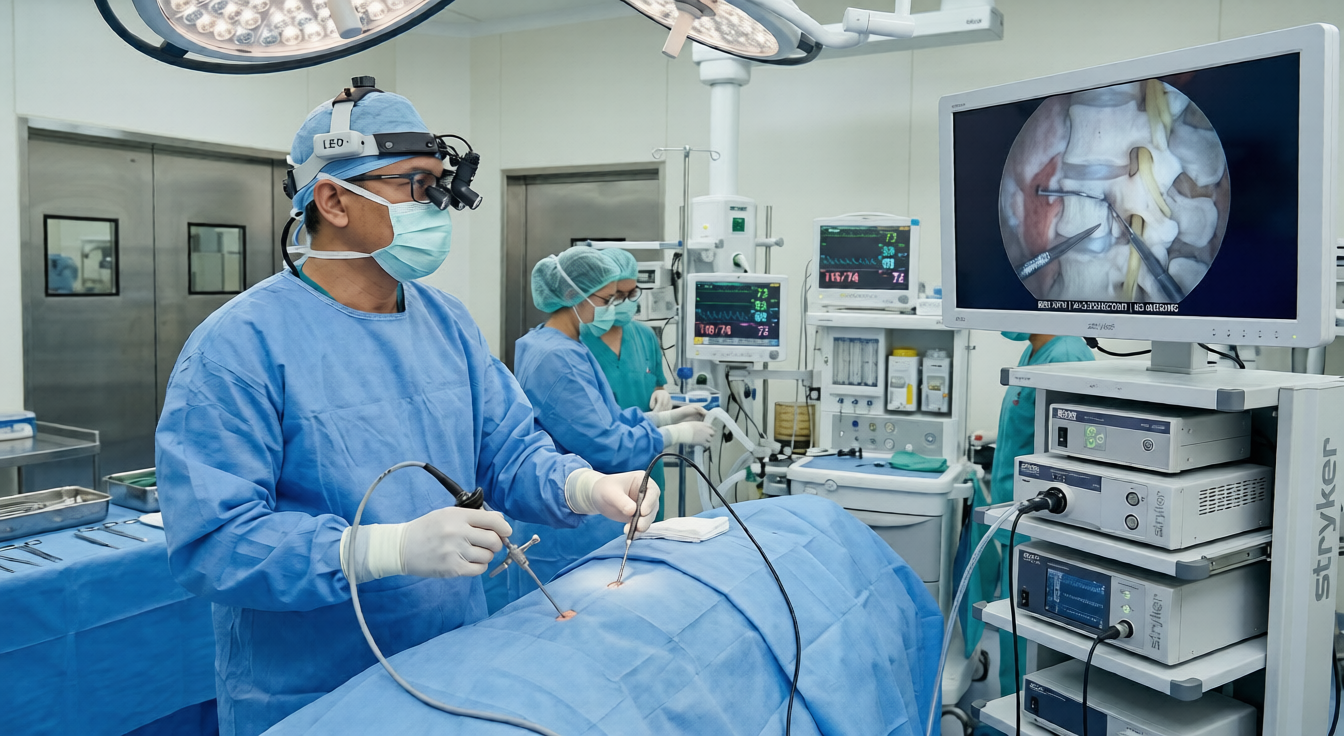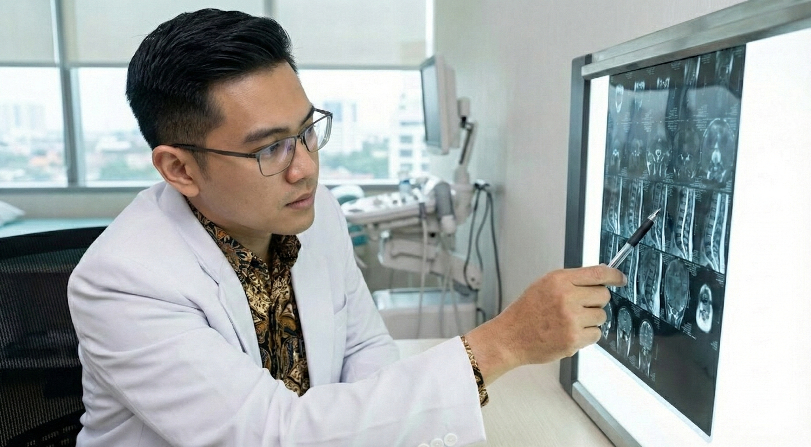 Tindakan & Hasil: BESS adalah prosedur bedah tulang belakang minimal invasif dengan dua sayatan kecil. Dokter menggunakan kamera endoskopi untuk melihat tulang belakang secara jelas dan akurat, memungkinkan pengangkatan jaringan diskus yang menekan saraf dengan presisi tinggi tanpa merusak jaringan sehat di sekitarnya.